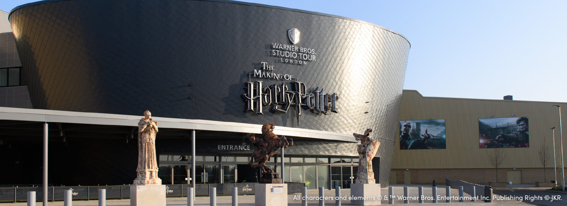Wide shot of front entrance of The Making of Harry Potter Studio Tour.